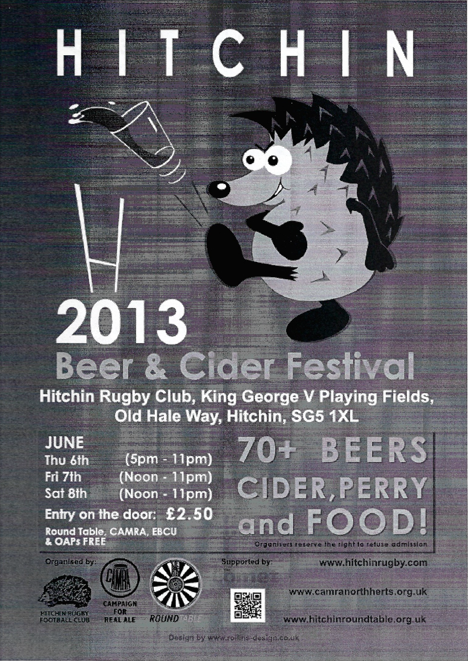 Our next problem was the closure of Hitchin Town Hall, prior to the long drawn-out process of it being converted to a museum. We were therefore without a venue for 2013 until Hitchin Rugby Club stepped in with the offer of holding the festival at the club after the end of the rugby season in June. It then became a three-way partnership between North Herts CAMRA, the Round Table and the Rugby Club.