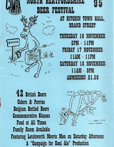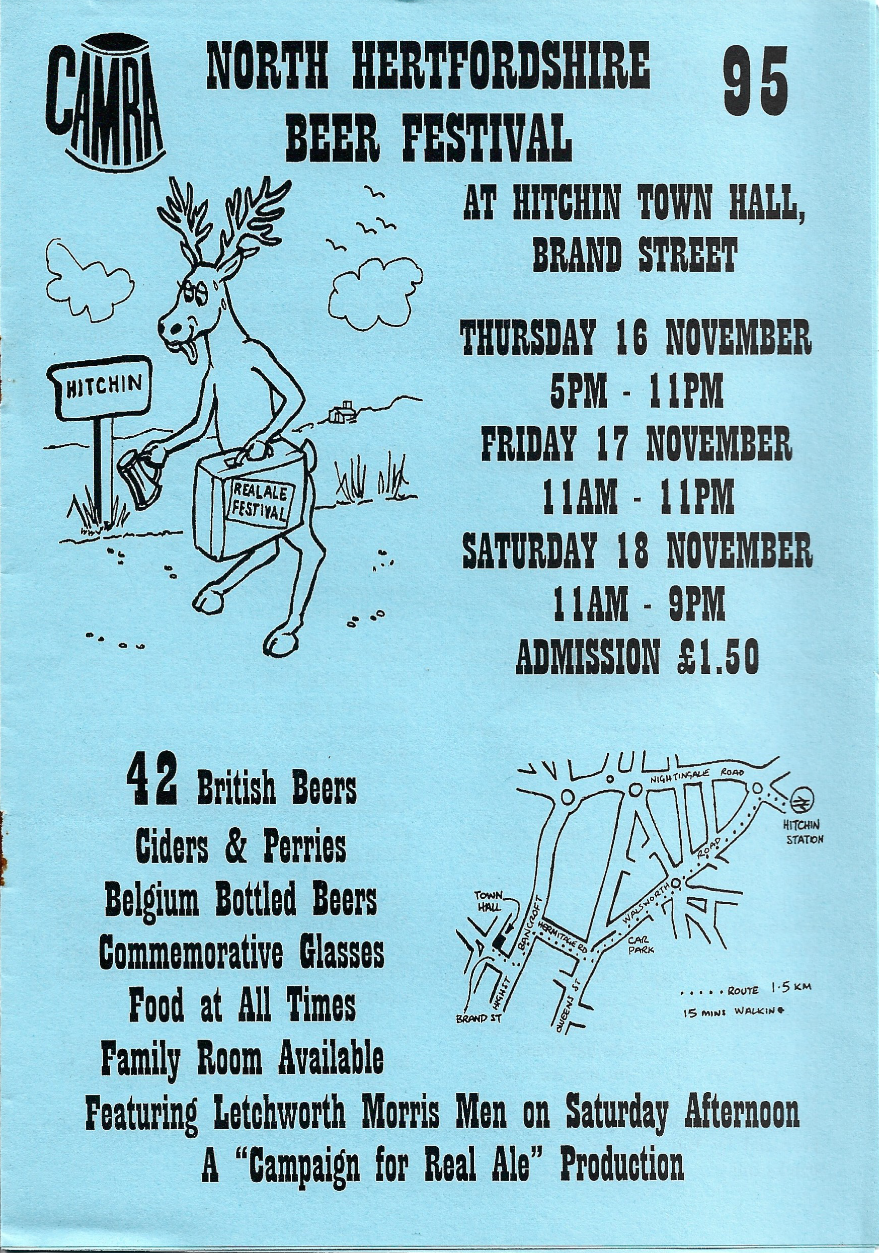 Several festivals in the Plinston Hall followed, until it was felt a larger venue was needed and we moved to Hitchin Town Hall for the first Hitchin Beer festival in November 1995. For the purpose of renting the Town Hall, we had got a preferential rate as a not-for-profit organisation, but when we asked to use that again we were told that we would be charged the commercial rent, so we returned to the Plinston Hall for September 1996.