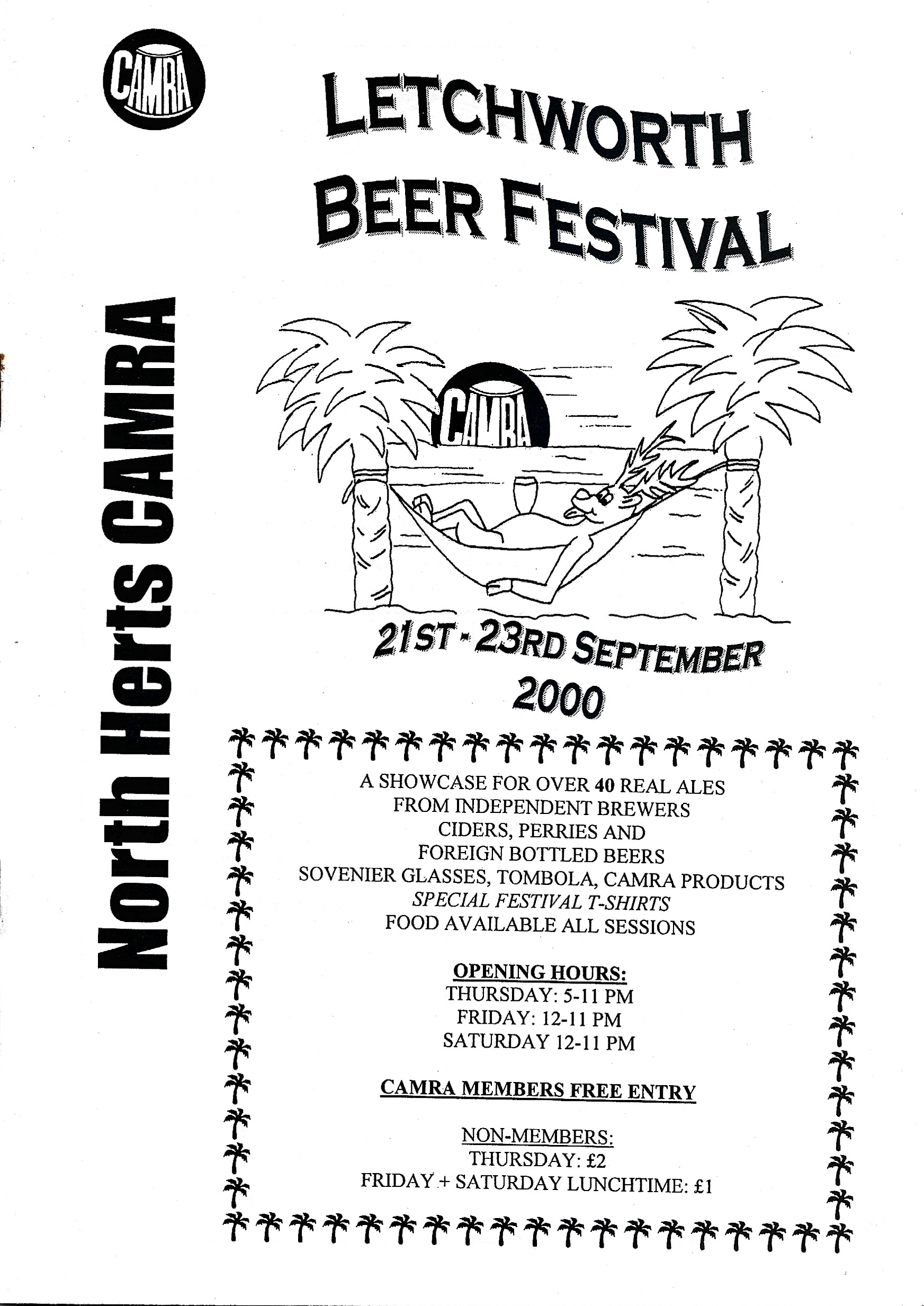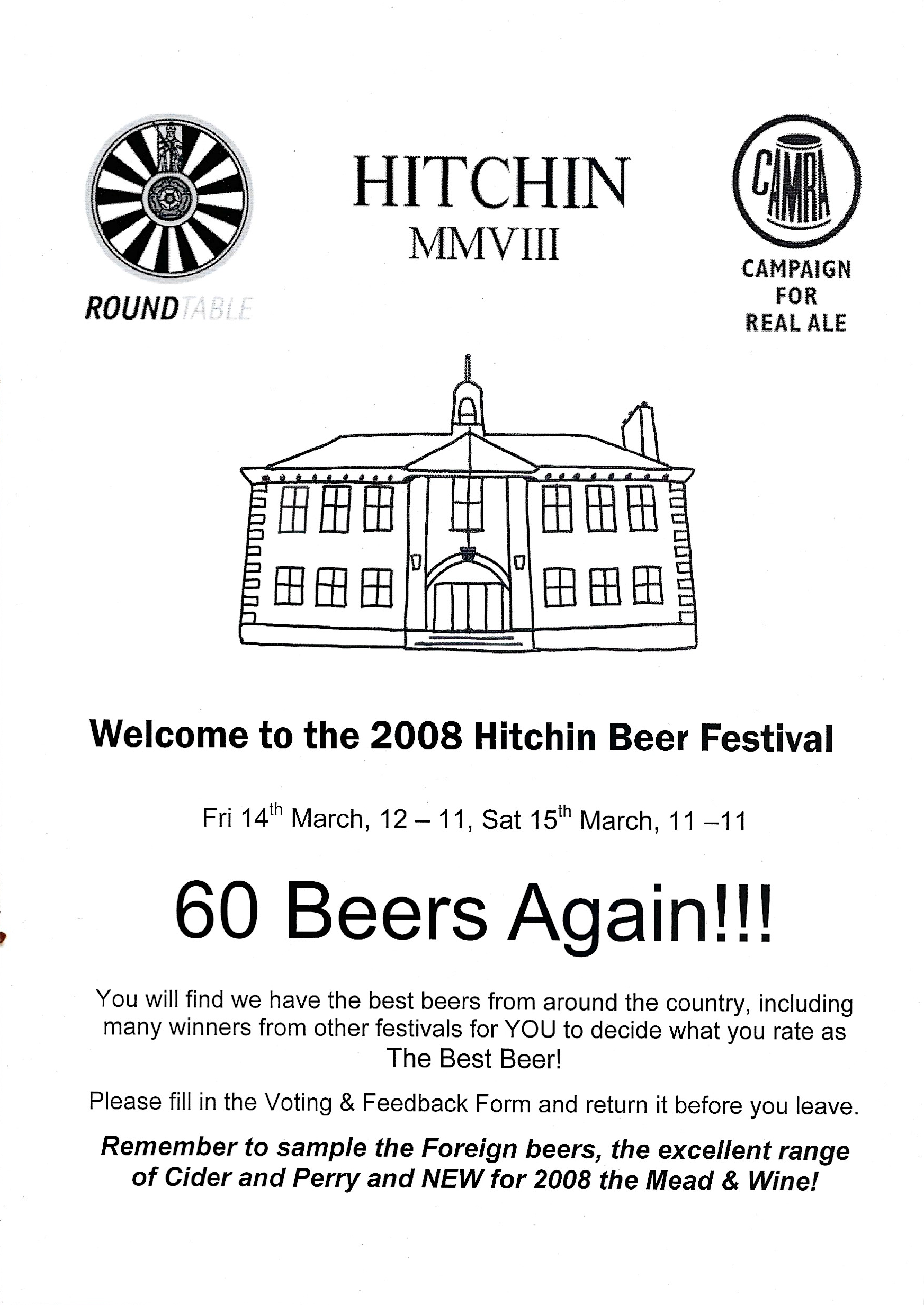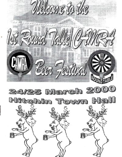 In 2000 a partnership with Hitchin Round Table was established, and were able to use their charitable status to get an economic rental rate for Hitchin Town Hall. Hence our second Hitchin Beer Festival was a joint event, and the start of a long collaboration with the Round Table. From 2000 to 2011 North Herts CAMRA held two festival a year, one at Hitchin Town Hall and an autumn Festival at the Plinston Hall in Letchworth.