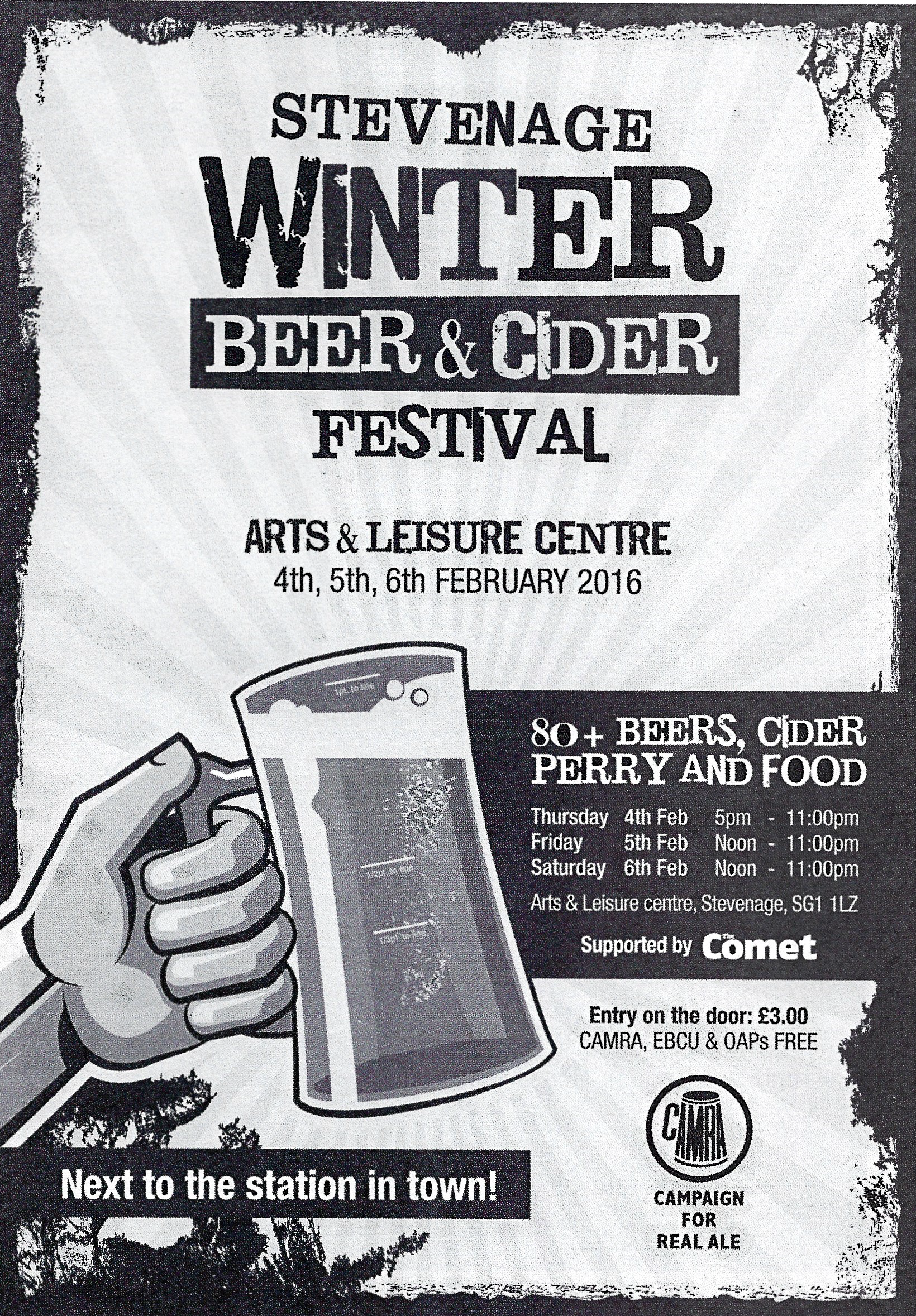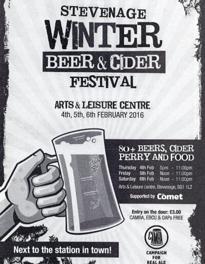 As CAMRA North Herts, we still wanted to do a separate Beer Festival of our own, so from February 2016 we hosted a Winter Beer Festival in Stevenage Arts & Leisure Centre. The Stevenage festival was repeated in 2017 and 2018, and then following a break of a year in 2020. This was one of the last festivals before the Covid lockdown struck, which meant there was no Hitchin festival in 2020.